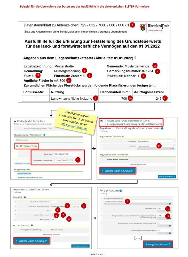 Die Steuerverwaltung sendet im Regelfall allen Eigentümerinnen und Eigentümern von Betrieben der Land- und Forstwirtschaft sowie von verpachteten Flächen (ehemals bezeichnet als Stückländereien) im August 2022 ein Informationsschreiben zu. Dieser Service dient als Hilfestellung zur Abgabe der Erklärung zur Feststellung des Grundsteuerwerts. Diesem Schreiben ist ein Datenstammblatt mit den der Steuerverwaltung vorliegenden Liegenschafts-/Geobasisdaten zum jeweiligen Grundbesitz sowie eine Erläuterung zum Ausfüllen der Erklärungen beigefügt.