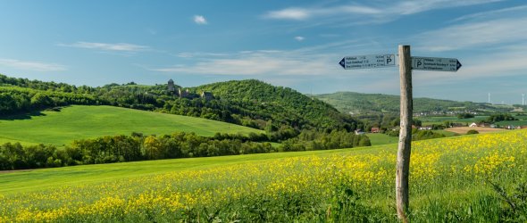 Ein bisschen Kondition sollte man schon mitbringen, denn der ca. 26,7 km lange Rundweg führt hoch hinauf in die „Preußischen Berge“ und ist auf der ganzen Strecke von einem steten Auf und Ab geprägt. Der Lohn für die Mühe: Fantastische Ausblicke über das Pfälzer Bergland und eine ganz andere Perspektive auf eines der Wahrzeichen der Region: Burg Lichtenberg.